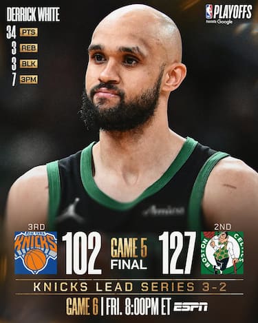 Non c’è ovviamente Jayson Tatum per i Celtics, Kristaps Porzingis (1 punto in 12 minuti giocati) è ancora fortemente limitato dal virus che l’ha colpito in questa primavera, ma in gara-5 i campioni NBA in carica si rifiutano di andare al tappeto e grazie ad un ottimo secondo tempo rimandano l’eventuale verdetto della serie almeno a gara-6. Dopo che le due squadre sono andate all’intervallo in perfetta parità, infatti, Boston si prende la partita grazie a una prestazione da grande squadra, ritrovando l’arma del tiro da tre (22/49 complessivo) e la solidità difensiva che lascia ai Knicks solo il 35.8% dal campo