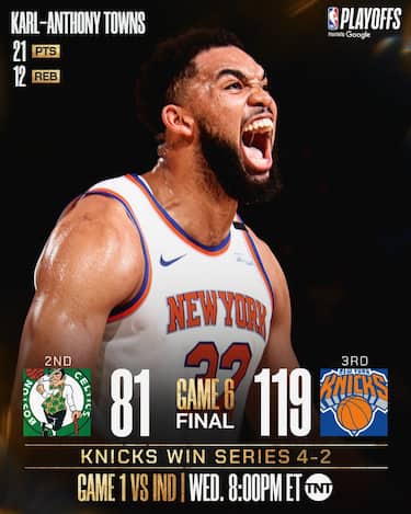 Dopo la grande prestazione di gara-5, con la reazione di squadra all’infortunio che ha tolto Jayson Tatum dalla serie, la resistenza dei Celtics al Madison Square Garden dura un quarto. L’energia di Boston, che nella prima frazione resiste all’aggressività degli avversari e alla spinta dei 19.812 spettatori sugli spalti, si esaurisce in un 2° quarto vinto dai Knicks con un parziale di 38-17. Avanti di 27 all’intervallo lungo, i padroni di casa non si guardano più indietro e il resto di gara-6 si trasforma in un lungo garbage time in cui le due squadre danno ampio spazio alle rispettive panchinee persino coach Tom Thibodeau evita di far giocare ai propri titolari i consueti quaranta minuti abbondanti