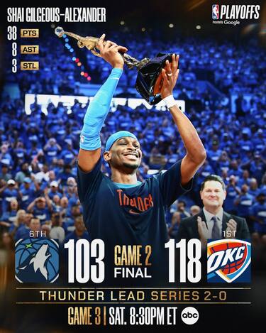 Dopo aver vinto gara-1 con un’accelerata nel secondo tempo, in gara-2 i Thunder controllano ritmo di gioco e punteggio fin dall’inizio e, ancora una volta, cambiano passo dopo l’intervallo lungo mettendo definitivamente le mani sulla partita. I Timberwolves riescono nel finale del 4° quarto a tornare sotto di 10 dopo aver accumulato uno svantaggio anche di 24 punti, ma la buona prestazione di Anthony Edwards (32 punti, 9 rimbalzi e 6 assist) non basta. Oklahoma City ribadisce la sua superiorità e grazie ai soliti Shai Gilgeous-Alexander (38 punti e 8 assist) e Jalen Williams (26 punti e 10 rimbalzi) si porta avanti 2-0 nella serie