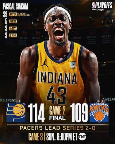 Trascinati dai 39 punti di un sensazionale Pascal Siakam, gli Indiana Pacers vincono anche gara-2 a New York, portandosi sul 2-0 nella serie. L’All-Star di Indiana sceglie il momento migliore per realizzare il suo massimo in carriera ai playoff, accompagnato dai 16 punti di Myles Turner e la tripla doppia sfiorata da Tyrese Haliburton, trascinando i suoi alla sesta vittoria consecutiva in trasferta. Ai Knicks non bastano i 36 punti con 11 assist di Jalen Brunson per evitare uno 0-2 in casa da cui mai nessuno è riuscito a rimontare in finale di conference nella storia della NBA. Gara-3 è prevista nella notte tra domenica 25 e lunedì 26 maggio a Indianapolis, come sempre in diretta su Sky Sport