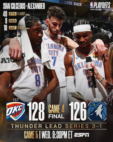 Il quarto episodio della serie tra Thunder e T'Wolves è quello probabilmente destinato a decidere la serie: una gara combattutissime e molto equilibrata, che gli ospiti portano a casa grazie alle cifre stratosferiche del terzetto Shai Gilgeous-Alexander, Jalen Williams, Chet Holmgren. Mentre Minnesota viene "tradita" da Edwards e Randle e a niente serve una panchina capace di produrre la bellezza di 64 punti. Ora OKC avrà il match point interno in gara-5 per staccare il biglietto verso le finali NBA