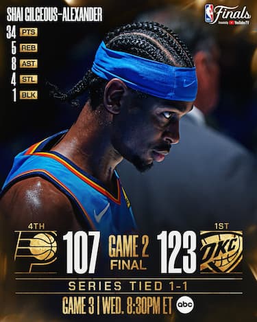 Come era successo già in gara-1, i Thunder dominano a lungo anche gara-2, ma questa volta non lasciano rientrare i Pacers nel finale e chiudono con una larga vittoria che riporta la serie in parità sull’1-1. A guidare Oklahoma City è ancora una volta uno scintillante Shai Gilgeous-Alexander da 34 punti e 8 assist, ma i padroni di casa mandano ben cinque giocatori oltre i 15 punti e trovano grandi risposte anche dalla loro panchina. Per Indiana serata opaca di Tyrese Haliburton, mentre i compagni non riescono a compensare la prestazione poco più che sufficiente del loro leader. Ora le Finals si trasferiscono a Indianapolis per gara-3, in programma nella notte tra mercoledì e giovedì