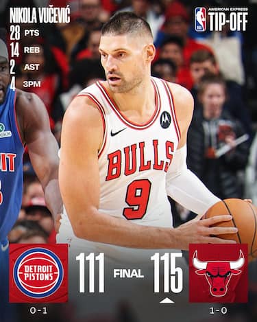 La partenza dei Bulls nella nuova stagione è a tratti travolgente, perché Chicago asfalta i Pistons con un 1° quarto quasi perfetto e chiuso avanti 35-19. Detroit, però, recupera man mano lo svantaggio e nell’ultimo parziale si riporta ad un solo possesso di distanza con un Cade Cunningham da 23 punti, 10 assist e 7 rimbalzi, ma a vincere sono comunque i padroni di casa, seppur di misura, con la doppia doppia da 28 punti e 14 rimbalzi di Nikola Vucevic