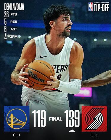 I Blazers, sconfitti di misura da Minnesota all’esordio e nel pieno del ciclone per l’arresto e la sospensione di coach Chauncey Billups, offrono una grande reazione e dopo un inizio equilibrato dominano e battono nettamente Golden State. Ottima prova di Deni Avdija (26 punti) per Portland, così come di Jerami Grant (22 punti) in uscita dalla panchina. Gli Warriors si aggrappano ai 35 punti con 12/22 dal campo del solito Steph Curry ma non basta