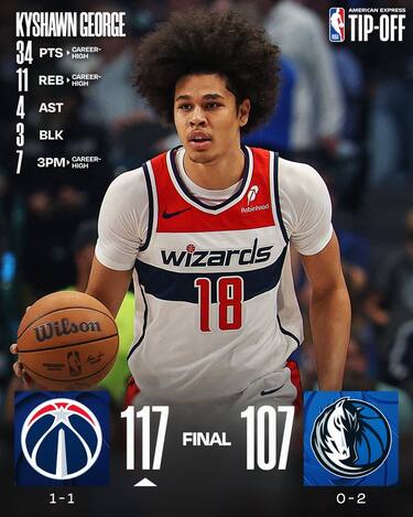 Dopo la netta sconfitta contro San Antonio all’esordio, i Mavs a sorpresa cadono anche contro Washington, che domina la parte centrale della gara trascinata da un Kyshawn George in stato di grazia (34 punti, 11 rimbalzi e 11/15 al tiro) e sbanca Dallas. Ai padroni di casa non basta la doppia doppia da 27 punti e 13 rimbalzi di Anthony Davis