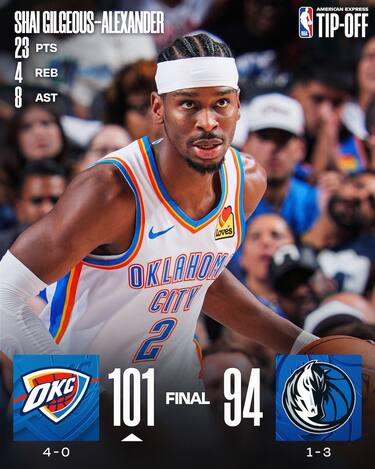 Non perde un colpo neanche OKC, che però dopo essere andata avanti di 22 punti deve faticare per resistere alla rimonta dei Mavs, tornati fino a -1 a 54 secondi dalla fine. I campioni in carica trovano però un canestro di Isaiah Hartenstein (16 punti e 12 rimbalzi) e due liberi di Shai Gilgeous-Alexander (23 punti) per resistere ai 26+11 di Anthony Davis. Serata storta per Cooper Flagg che si ferma a 2 punti con 1/9 al tiro in 31 minuti ed esce per un problema alla spalla