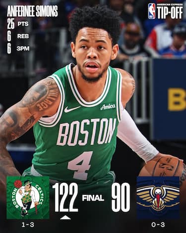 Primo successo anche per i Celtics, che passano sul campo di una New Orleans priva di Zion Williamson (problema a un piede). Anfernee Simons segna 25 punti con 6 triple e Payton Pritchard ne aggiunge 18 per confezionare un parziale di 31-4 con cui gli ospiti aprono in due la partita nel quarto periodo, rendendo inutili i 22 di Jordan Poole per i padroni di casa ancora senza vittorie