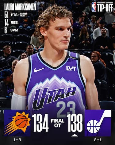 Lauri Markkanen realizza il suo nuovo massimo in carriera da 51 punti (ai Jazz non capitava dai tempi di Karl Malone di vedere un giocatore superare quota 50) e i Jazz rimediano al parziale di 7-0 subito negli ultimi 19 secondi dei regolamentari. Nell’overtime infatti Markkanen è glaciale (17/17 ai liberi) e Utah può godersi anche i 26 di Keyonte George e i 25 di Walker Kessler, mentre per i Suns si rivelano inutili i 34 di Devin Booker, complici le assenze di Jalen Green (bicipite femorale) e Dillon Brooks (inguine)