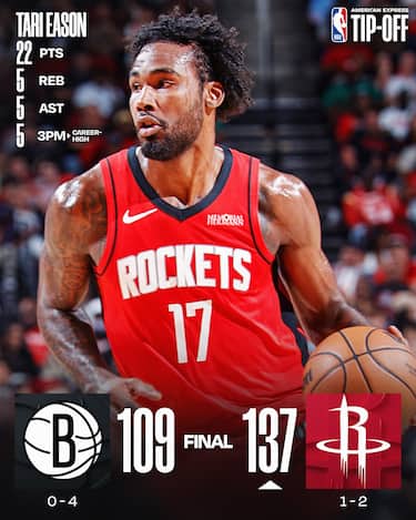 Primo successo stagionale per i Rockets, che si sbarazzano dei Nets in una sfida tra squadre che non avevano ancora vinto. Tari Eason è il migliore realizzatore con 22 punti seguito dai 21 di Alperen Sengun, mentre l’ex Kevin Durant ne aggiunge 19 in una sfida in cui i padroni di casa hanno toccato anche il +33. Per i Nets ci sono 21 punti di Terance Mann e 18 di Michael Porter Jr.