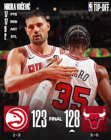 Terza vittoria su tre per i Bulls, che rimontano 13 punti di svantaggio e battono Atlanta grazie a otto giocatori in doppia cifra guidati dai 21 di Ayo Dosunmu e la tripla doppia sfiorata da Nikola Vucevic (17 punti, 17 rimbalzi, 9 assist). I ritorni in campo di Kristaps Porzingis (27 punti) e Jalen Johnson (25) non servono agli Hawks per evitare il terzo ko su quattro partite disputate, nonostante i 21 punti e 17 assist di Trae Young