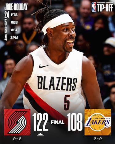 Austin Reaves è ancora una volta strepitoso e segna 41 punti, ma nessuno dei suoi compagni sostiene il suo sforzo e i Lakers privi di LeBron, Doncic, Marcus Smart e Gabe Vincent perdono in casa coi Blazers. Deni Avdija con 25 punti e Jrue Holiday con 24 guidano Portland al primo successo esterno stagionale, approfittando delle 25 palle perse forzate ai gialloviola e del pessimo 7/27 da tre dei padroni di casa