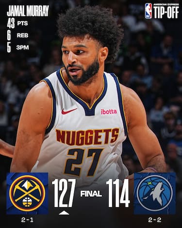 Un terzo quarto mostruoso di Jamal Murray (23 dei suoi 43 punti solo in quella frazione) e la terza tripla doppia in tre partite di Nikola Jokic (25 punti, 19 rimbalzi e 10 assist) bastano ai Nuggets per superare una versione di Minnesota priva di Anthony Edwards. Gli ospiti non vanno oltre i 25 punti di Jaden McDaniels e i 24 di Julius Randle
