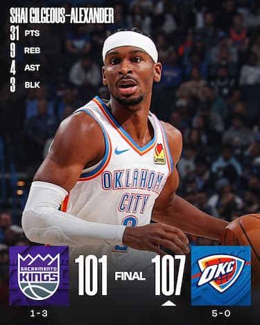 Ci vuole uno Shai Gilgeous-Alexander da 9 punti nel solo 4° quarto e da 31 totali ai Thunder per battere una versione dei Kings più combattiva del previsto e mantenere l’imbattibilità in stagione. I Kings giocano un’ottima partita fino al 3° quarto, grazie soprattutto ad un Zach LaVine da 23 punti e 4/6 al tiro dalla lunga distanza, ma nell’ultimo parziale la difesa di Oklahoma City sale di colpi e lascia agli avversari solo 18 punti totali, risolvendo così una serata che si era fatta più complicata del previsto