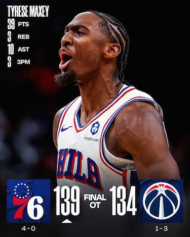 Quarta partita in stagione e quarta vittoria per i sorprendenti Sixers, a cui serve però un tempo supplementare per vincere a Washington, dove gli Wizards vanno avanti anche di 26 e nel 4° quarto sono ancora avanti di 16. Philadelphia, che ha 25 punti in 23 minuti da un Joel Embiid apparso in netto progresso dal punto di vista fisico e 39 da un Tyrese Maxey inarrestabile, rimonta e, quando Khris Middleton sbaglia il tiro della possibile vittoria allo scadere dei regolamentari, si va all’overtime, con la squadra di coach Nick Nurse ad avere la meglio