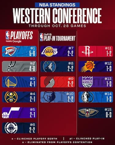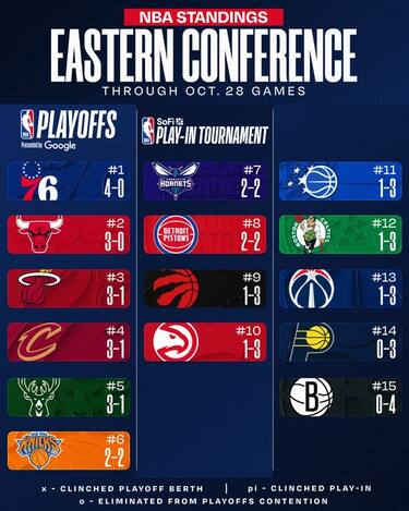 Un po' a sorpresa sono Sixers e Bulls a comandare per ora nella Eastern Conference, mentre Indiana e Brooklyn devono ancora trovare la loro prima vittoria in stagione