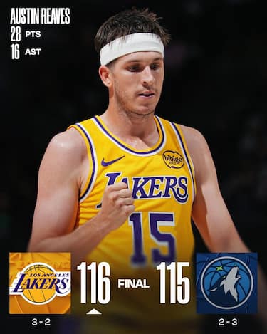 È il jumper sulla sirena finale di un Austin Reaves (28 punti e 16 assist) a regalare ai Lakers una vittoria che dopo aver subito un parziale di 14-2 negli ultimi minuti di gara sembrava essere sfuggita di mano ai gialloviola. A Minnesota, priva della sua stella Anthony Edwards, non bastano i 33 punti di Julius Randle e i 30 di Jaden McDaniels, mentre coach JJ Redick riesce ad ottenere un successo importante senza Luka Doncic e LeBron James