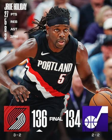 Ai Blazers ci vuole tutta la freddezza del veterano Jrue Holiday (27 punti e 8 assist), che nel finale segna i liberi che fermano la rimonta di Utah, per passare sul campo dei Jazz. I padroni di casa si svegliano tardi, solo nel 4° quarto, e sfiorano solamente la vittoria dopo essere andati sotto anche di 25 punti e sprecano le prestazioni da 32 punti di Lauri Markkanen e da 29 di Keyonte George