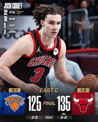 Continua la corsa dei Bulls, vera e propria rivelazione di questo inizio stagione, che in casa battono nettamente New Yorkforti di un primo tempo di grande autorevolezza. Per Chicago è ancora una volta la panchina, che surclassa per 53-21quella dei Knicks, a fare la differenza mentre Josh Giddey conferma il suo eccellente stato di forma sfiorando la tripla doppia con 32 punti, 10 rimbalzi e 9 assist