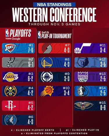 I Lakers conquistano la sesta vittoria su otto e tengono il passo al terzo posto, seguiti da Denver, Houston e Minnesota a quota 4 vittorie. Utah scavalca Memphis, mentre Sacramento e Dallas rimangono fuori dalla zona play-in