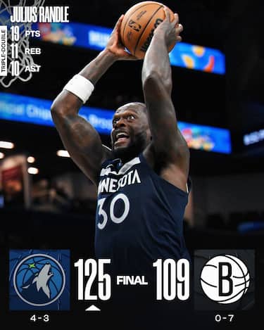 Julius Randle firma la sua 15^ tripla doppia in carriera chiudendo con 19 punti, 11 rimbalzi e 10 assist, regalando ai T’Wolves la seconda vittoria in fila senza Anthony Edwards. Settima sconfitta consecutiva invece per i Nets, a cui non servono i 25 di Cam Thomas per trovare il primo successo in questa stagione.
