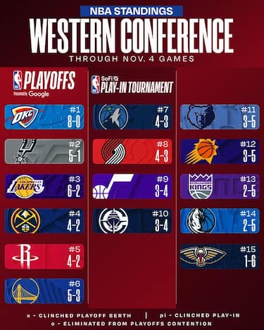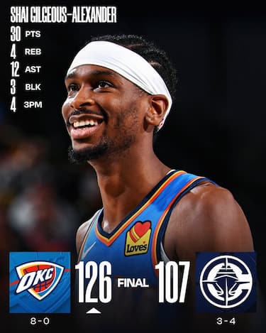 OKC continua la sua corsa solitaria e rimane, unica imbattuta in tutta la NBA, ampiamente in testa alla Western Conference. In coda New Orleans si risolleva un po' il morale con la prima vittoria stagionale