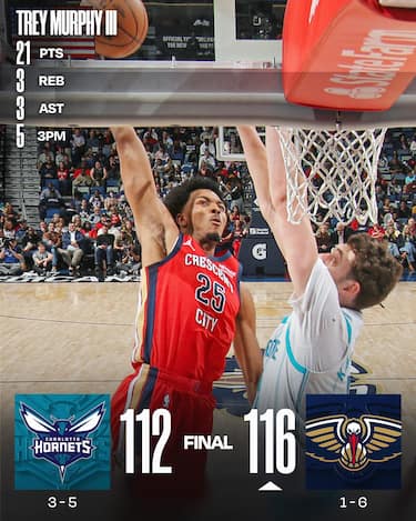 Ci vuole un ottimo 4° quarto e una tripla di Jose Alvarado (18 punti in uscita dalla panchina) nel finale ai Pelicansper battere Charlotte e ottenere la prima vittoria in questa regular season. New Orleans non ha Zion Williamson, fermo per almeno dieci giorni, ma trova un Trey Murphy III da 21 punti e una panchina che ne mette 62 complessivi, mentre gli Hornets vanificano la doppia doppia da 20 punti e 12 rimbalzi del rookie Kon Knueppel
