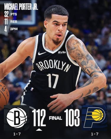 La prima vittoria in questa stagione per Brooklyn arriva in trasferta sul campo dei vicecampioni NBA, dove i Nets partono meglio, si fanno recuperare ma nel 4° quarto ritrovano il ritmo giusto e grazie alla doppia doppia da 32 punti e 11 rimbalzi di Michael Porter Jr. piazzano il colpo in trasferta. Per Indiana, falcidiata dagli infortuni, serata storta che un Pascal Siakam da 23 punti e 10 rimbalzi non riesce a raddrizzare