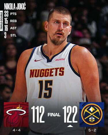 Ci vuole una sontuosa tripla doppia da parte di Nikola Jokic, autore di una prova da 33 punti, 15 rimbalzi e 16 assist con anche 3 palle recuperate e 12/18 al tiro, ai Nuggets per avere la meglio di una Miami ancora una volta molto solida. I 23 punti di Norman Powell e i 22 di Andrew Wiggins, però, non bastano agli Heat, che pagano una fase centrale della gara con troppe distrazioni in difesa. Solo 5 punti per Simone Fontecchio, che gioca una buona partita nella metà campo amica ma tira solo 2/7