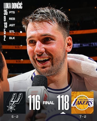 È Julian Champagnie, che a cronometro della partita praticamente scaduto sbaglia i due liberi che potrebbero portare ai supplementari, a regalare di fatto la vittoria in rimonta ai Lakers. Luka Doncic, autore di 35 punti, 13 assist e 9 rimbalzi, in assenza anche di Austin Reaves si prende sulle spalle la squadra, che dopo essere andata sotto in doppia cifra gioca un eccellente 4° quarto. Serataccia invece per Victor Wembanyama, che chiude con 19 punti e 8 rimbalzima tira 5/14 dal campo e a 1:39 dalla fine esce per falli
