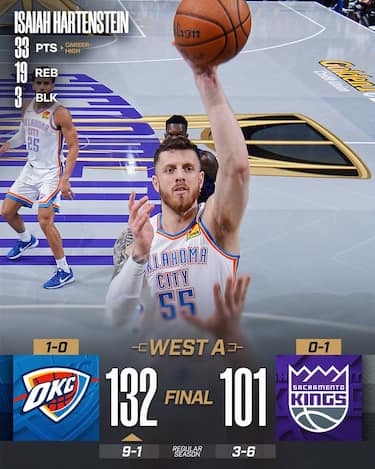 La resistenza dei Kings all’arrivo sul loro campo dei campioni NBA in carica dura giusto un quarto, perché già nella seconda frazione di gioco i Thunder scappano via e vanno in fuga senza più guardarsi indietro. Oltre agli abituali 30 punti di Shai Gilgeous-Alexander, Oklahoma City trova il career high di uno scatenato Isaiah Hartenstein da 33 punti e 19 rimbalzi con 14/17 al tiro, mentre il grande ex di serata Russell Westbrook prova a fare ciò che può e chiude con 24 punti e 9 assist
