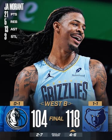 Nella sfida tra due squadre già in crisi in questo inizio di stagione ha la meglio Memphis, che parte meglio e grazie ad un Ja Morant finalmente convincente con la doppia doppia da 21 punti e 13 assist battono nettamente Dallas. Altra serata complicata invece per i Mavs, che perdono la quarta partita consecutiva e hanno in Max Christie (18 punti) l’unico elemento positivo sul parquet