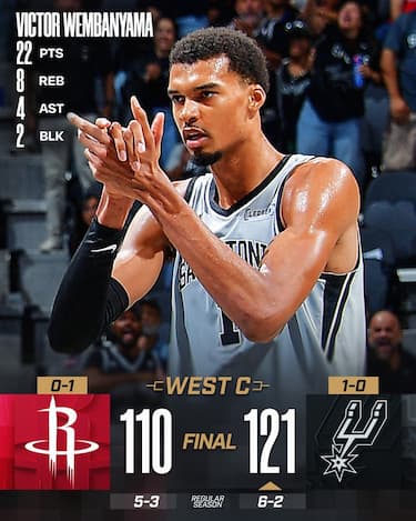 Il derby texano premia gli Spurs, che battono Houston in volata trovano i canestri decisivi nel 4° quarto dal veterano Harrison Barnes (24 punti e 8/11 dal campo) e da Julian Champagnie (22 punti). Serata quasi normale per Victor Wembanyama (22 punti e 8 rimbalzi), oggetto delle cure della difesa dei Rockets, a cui però nell’altra metà campo non bastano i 25 punti con tripla doppia sfiorata da Alperen Sengun e i 24 di Kevin Durant