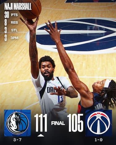 Dallas torna a vincere dopo quattro sconfitte in fila grazie ai 30 punti realizzati da Naji Marshall e gli 8 negli ultimi 5 minuti di PJ Washington, decisivi per trovare la prima vittoria in trasferta della stagione. Gli Wizards non riescono ad approfittare delle assenze di Anthony Davis e Klay Thompson, perdendo l’ottava partita consecutiva nonostante i 25 punti di CJ McCollum (solo 2 però dopo l’intervallo)