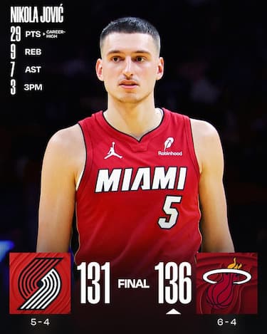 Partita ad alto punteggio a Miami, dove a spuntarla sono gli Heat guidati dal miglior Nikola Jovic della carriera: 29 punti, 9 rimbalzi e 7 assist uscendo dalla panchina, riuscendo così a sopperire alle assenze di Tyler Herro e Bam Adebayo. Simone Fontecchio chiude con 7 punti e 1 rimbalzo nei quasi 18 minuti in cui rimane in campo (2/4 da tre), aiutando comunque i suoi a superare i 33 punti realizzati da Deni Avdija per i Blazers