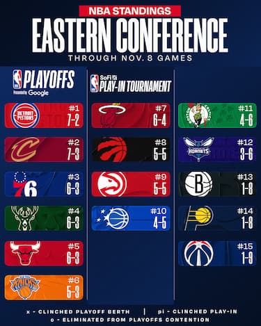 La sconfitta di Chicago apre le porte a Detroit e Cleveland, in vetta con 7 vittorie a testa (e una sconfitta in meno per i Pistons). Miami tiene botta nonostante le assenze, Washington sempre più giù con 8 sconfitte in fila