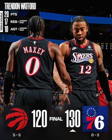 Ai 60 punti della coppia Maxey-Embiid (31 per il primo e 29 per il secondo) si aggiunge la sorprendente tripla doppia di Trendon Watford (20 punti, 17 rimbalzi e 10 assist) per superare i Raptors, avversario che lo scorso anno ha vinto tutte le 4 partite contro i Sixers. RJ Barrett e Immanuel Quickley ne mettono 22 a testa, ma non riescono ad allungare a cinque la striscia di successi consecutivi dei canadesi