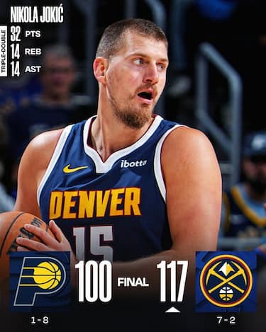 Il conto delle triple doppie di Nikola Jokic sale a 6 in 9 partite stagionali, rifilandone una da 32 punti, 14 rimbalzi e 14 assist ai malcapitati Pacers. Senza Jamal Murray e Aaron Gordon nella seconda partita di un back-to-back, i Nuggets hanno anche 16 punti da Peyton Watson e 17 da Tim Hardaway Jr, mentre i Pacers martoriati dagli infortuni non vanno oltre i 25 di Aaron Nesmith e i 22 del rientrante Andrew Nembhard