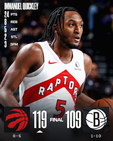 A Brooklyn i Raptors vincono la loro 5^ partita nelle ultime 6 giocate dominando a rimbalzo, 50-36 il conteggio complessivo, e mandando tutto il quintetto iniziale in doppia cifra con Brandon Ingram (25 punti) e Immanuel Quickley (24) a condurre il gruppo. Altra serata amara invece per i Nets, che si possono consolare con i progressi mostrati in campo dal rookie Egor Demin, autore di una prova da 16 punti e 5 assist
