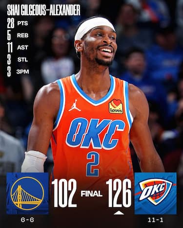 Nella trasferta di Oklahoma City gli Warriors recuperano Steph Curry, che però incappa in una serataccia al tiro con 4/14 e solo 11 punti segnati, ma i Thunder ribadiscono la loro superiorità con una vittoria mai apparsa in dubbio fin dalla palla a due. I padroni di casa chiudono già a +19 all’intervallo lungo e controllano nella seconda metà della partita, passeggiando con la doppia doppia da 28 punti e 11 assist di Shai Gilgeous-Alexander e quella da 23 punti e 11 di Chet Holmgren