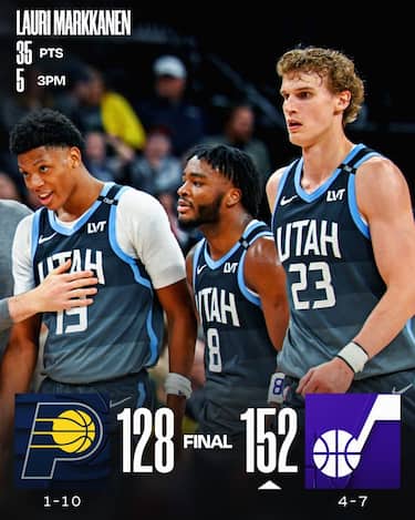 Partita a punteggio alto a Salt Lake City, dove le difese non brillano per entrambe le squadre e i Jazz si dimostrano più svelti nell’adattarsi al ritmo complessivo della gara, prendendo quindi il largo nella sua fase centrale. Lauri Markkanenchiude da miglior marcatore con 35 punti e il rookie Ace Bailey ne mette 20 per i padroni di casa, mentre dall’altra parte i 27 di Pascal Siakam e i 25 di Andrew Nembhard servono poco a Indiana, che colleziona la sua 10^ partita in 11 partite in questo difficilissimo inizio di stagione per i vicecampioni NBA