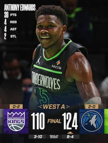 I Kings rimangono in partita per tre quarti grazie ai 34 punti con 11 rimbalzi di Domantas Sabonis e la 205^ tripla doppia della carriera di Russell Westbrook (13 punti, 10 rimbalzi e 14 assist), ma devono arrendersi di nuovo ai T’Wolves subendo la quinta sconfitta in fila. I padroni di casa scappano via in un ultimo quarto vinto per 32-19 con 30 punti di Anthony Edwards, 25 di Julius Randle e 20 di Donte DiVincenzo, conquistando il quarto successo consecutivo e il secondo in NBA Cup