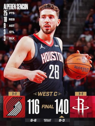 Terzo successo in fila per i Rockets, a cui bastano 30 punti di Kevin Durant e una tripla doppia sfiorata da Alperen Sengun (25 punti, 10 rimbalzi e 9 assist) per avere ragione dei Blazers, salendo a un record di 1-1 in NBA Cup. Gli ospiti commettono 20 palle perse tramutate in 30 punti dai texani, senza andare oltre i 22 punti con 10 rimbalzi di Deni Avdija