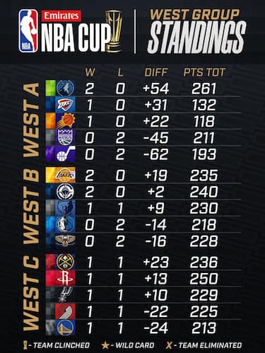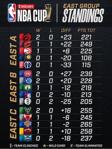 Questa la situazione nei tre gruppi della Eastern Conference della NBA Cup, dove quattro squadre rimangono imbattute e cinque invece non sono ancora riuscite a vincere
