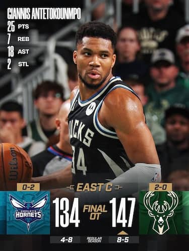 Milwaukee ritrova Giannis Antetokounmpo (25 punti, 7 rimbalzi e 18 assist) e si prende la rivincita su Charlotte, contro cui aveva perso due giorni fa. Kon Knueppel, stellina liceale proprio a Milwaukee, ne mette 32 per il suo nuovo massimo stagionale e forza un tempo supplementare, nel quale però i Bucks hanno vita facile vincendolo per 18-5 complici i 29 di Kyle Kyzma, rendendo inutili i 32 di Miles Bridges e i 16 con 10 assist di LaMelo Ball