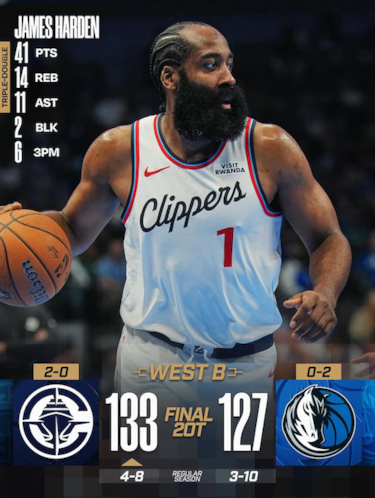 Servono due overtime per decidere la sfida tra Mavs e Clippers, risolta alla fine in favore degli ospiti trascinati da una versione vintage di James Harden. Il Barba sente aria texana e torna ai suoi fasti di Houston firmando la sua 82^ tripla doppia della carriera con 41 punti, 14 rimbalzi e 11 assist, mettendone 10 nei supplementari per interrompere una striscia di sei sconfitte in fila, complici anche i 27+11 di Ivica Zubac. A Dallas non bastano i 28 di Naji Marshall e di D’Angelo Russell dalla panchina per evitare il settimo ko nelle ultime otto