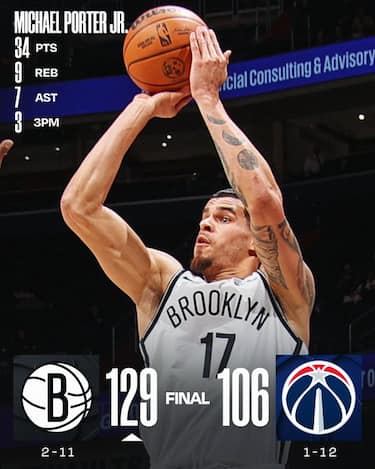 Nella sfida tra squadre che finora avevano vinto una sola partita la spuntano i Nets, che ringraziano i 34 punti di Michael Porter Jr e i 7 consecutivi di Tyrese Martin a fine terzo quarto per infliggere agli Wizards l’11° ko in fila. Ai padroni di casa non bastano i 29 di Kyshawn George per evitare di perdere per la sesta volta su sei davanti al proprio pubblico, crollando a inizio quarto periodo complice un parziale di 14-4 per i Nets