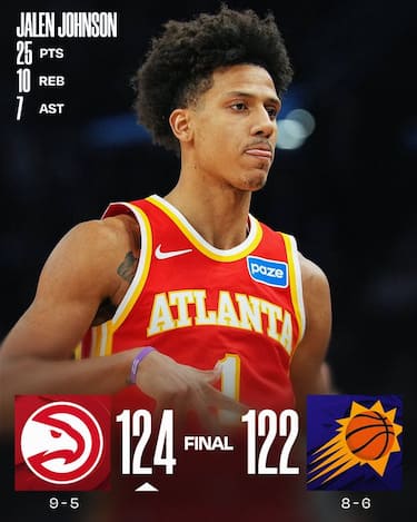 Vittoria folle degli Hawks, che rimontano 22 punti di svantaggio nel quarto periodo e ribaltano i Suns a domicilio, vincendo per la quinta partita consecutiva (di cui le ultime 4 in trasferta a ovest). Onyeka Okongwu continua il suo grande momento mettendone 27, Nickeil Alexander-Walker ne aggiunge 26 e Jalen Johnson chiude con 25 con 10 rimbalzi, fermando la striscia dei Suns che vincevano da cinque partite in fila. I 34 punti di Dillon Brooks e i 27 di Devin Booker non bastano ai padroni di casa, che dopo un terzo quarto da 37-20 vengono travolti dagli ospiti per 47-27 nel quarto periodo