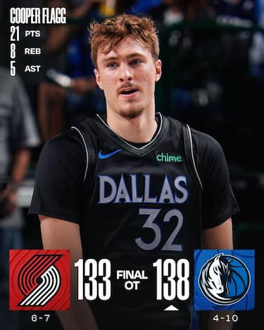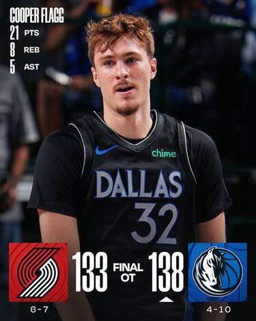 Dallas torna a vincere dopo tre sconfitte consecutive, trovando i contributi in doppia cifra di sette giocatori diversi (a partire dai 21 a testa di Cooper Flagg e PJ Washington) e supera Portland con un tempo supplementare perfetto al tiro (7/7). I Blazers perdono così per la quarta volta nelle ultime cinque partite nonostante il massimo stagionale da 36 punti di Shaedon Sharpe e i 29 di Deni Avdija, sprecando un vantaggio enorme sotto canestro (22 rimbalzi offensivi per un vantaggio di 32-10 nei punti da seconda opportunità)