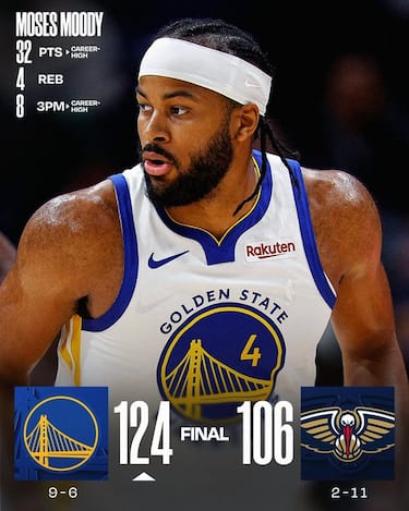 Per una sera Moses Moody si traveste da Steph Curry, ritoccando i propri massimi in carriera per punti (32) e triple segnate (8) nella facile vittoria degli Warriors a New Orleans. Curry si prende una serata di pausa (9 punti con 2/11 al tiro dopo i 95 delle ultime due partite), ma gli altri Warriors bastano e avanzano per infliggere a James Borrego la sua prima sconfitta sulla panchina dei Pelicans, che non trovano la vittoria da 5 gare e sono ultimi nella Western Conference senza andare oltre i 20 punti di Trey Murphy III