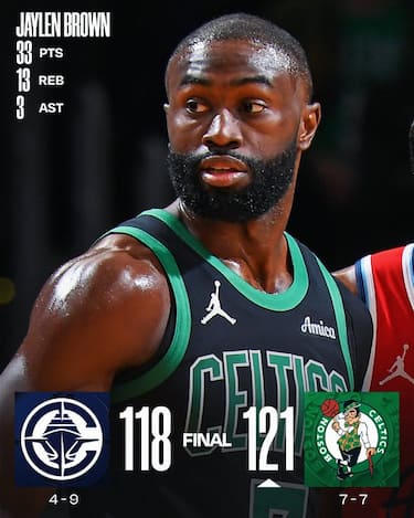 I Celtics vanno avanti di 24 lunghezze nel terzo quarto, ma rischiando di sprecare tutto il vantaggio facendosi rimontare fino al -1 a 3 secondi dalla fine da uno strepitoso James Harden (32 dei suoi 37 punti nel solo secondo tempo), il quale però sbaglia poi la tripla della possibile parità. I biancoverdi riescono così a trovare la vittoria che li riporta ad un record del 50% grazie ai 33 punti di Jaylen Brown e i 30 di Payton Pritchard (8/13 dalla lunga distanza)